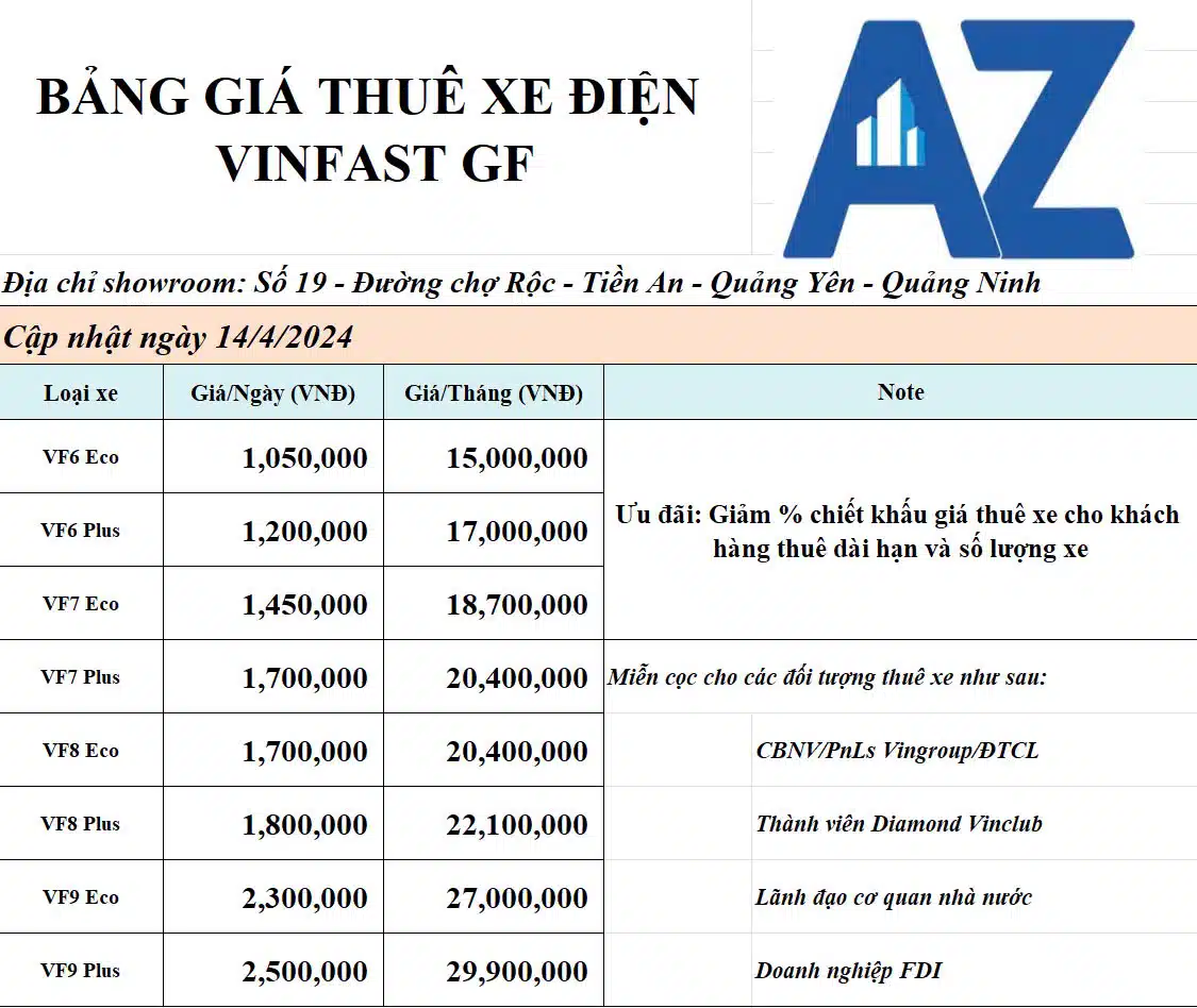 Dưới đây là bảng giá tham khảo cho các dòng xe tự lái 4, 5 chỗ tại Legend Holdings. Giá có thể thay đổi tùy thời điểm và chính sách (liên hệ hotline 0589.353.353 để được báo giá chính xác):